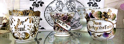 Die Erinnerungstassen waren weniger für den täglichen Gebrauch gedacht, sondern wurden als Repräsentationsstücke in den Vitrinen der biedermeierlichen Wohnzimmer zur Schau gestellt. Bei fast allen Manufakturen ließen sich individuelle Dekore und Beschriftungen bestellen. Im Gegensatz zu heute lag dabei die Schauseite der Tasse dem Henkel genau gegenüber, damit er die Wirkung von Malerei und Beschriftung nicht störte. Besonders beliebt waren im Biedermeier die Ansichtentassen mit dem Bild einer Landschaft oder einer Stadt. Daneben gab es auf den Tassen alle möglichen anderen Darstellungen wie Landkarten, Reliefporträts, Hausfassaden, Blumenbilder, Rosenblüten, Vögel oder bekannte Bauwerke. Weit verbreitet waren außerdem Tassen mit Sinnsprüchen.