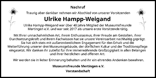 Im Alter von 76 Jahren ist die 1.Vorsitzende der Museumsfreunde Mertingen e.V., Frau Ulrike Hampp-Weigand nach schwerer Krankheit verstorben.